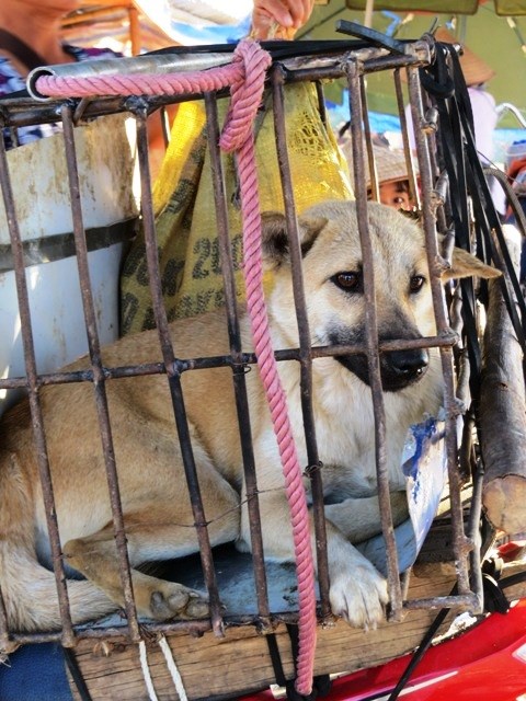 helpless from their bound feet. We saw a dog in a cage on the back of a scooter