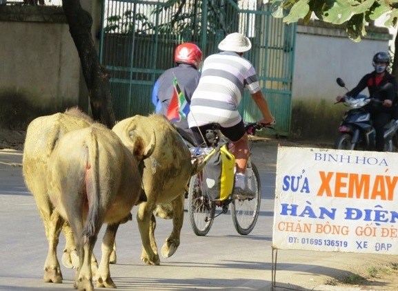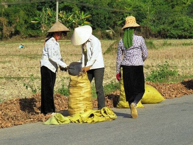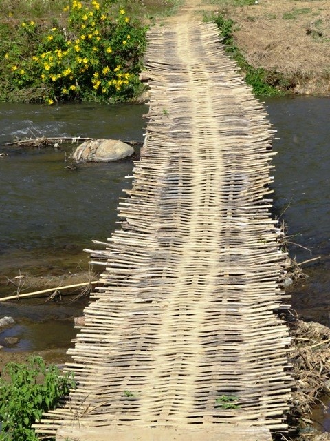 bikes, or walking home with a hoe over their shoulders; rickety bamboo bridges