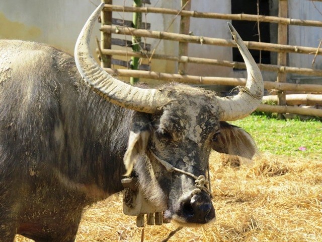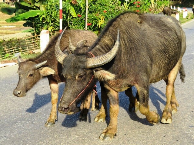 outcrops towering above the rustic homes at their base; muddy water buffalo in