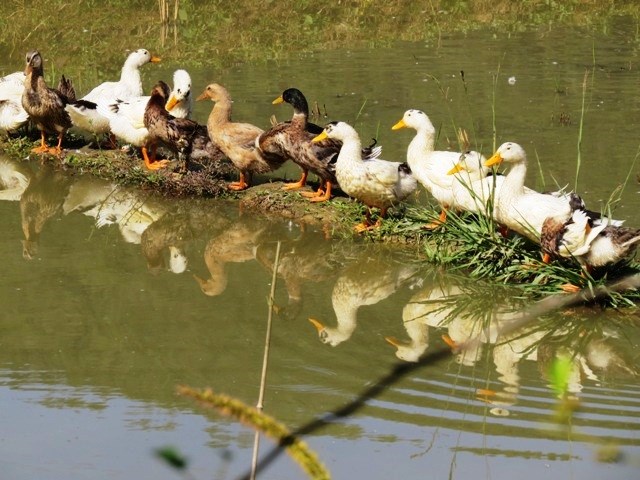 chickens with their chicks and ducks with their ducklings, scurrying across the