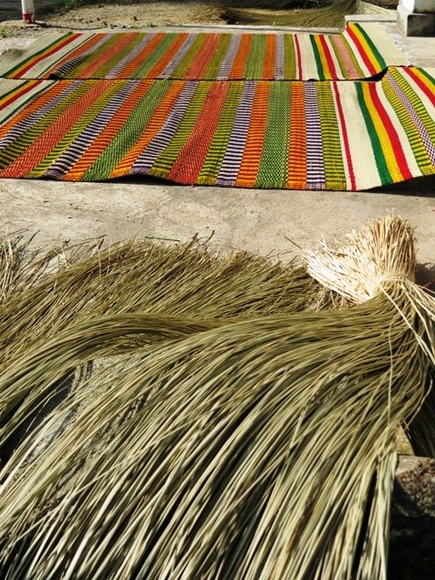 reeds for mats laid out to dry, coloured green and red and mustard; and drank