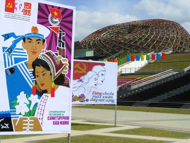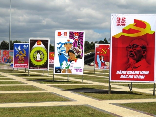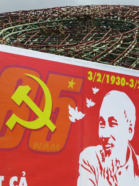 been unable to identify, above a square lined with propaganda posters and red