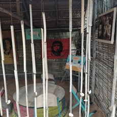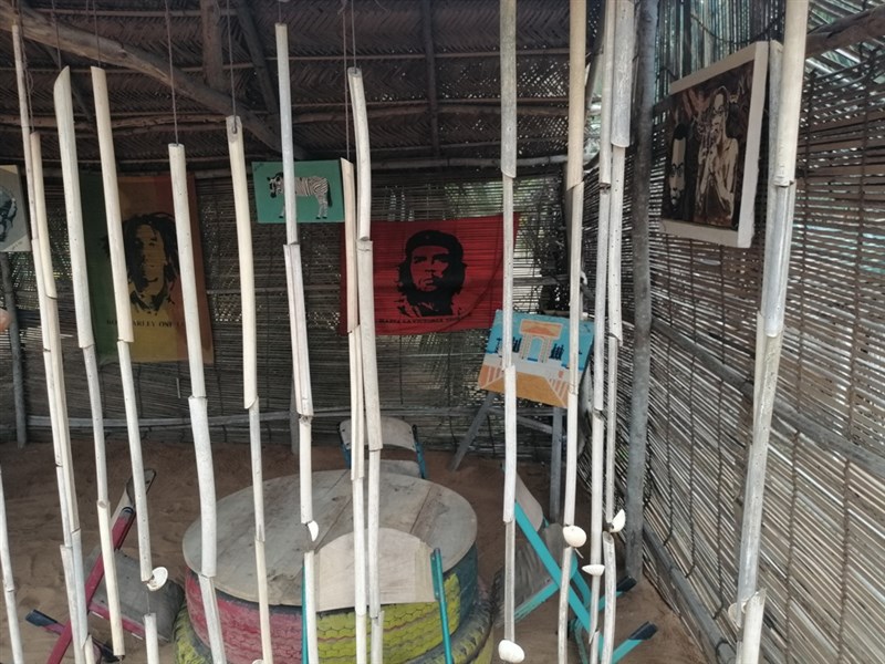 We went into a shop-house on the beach where the proprietor made us an omelette and citron tea. The floor of his home was beach sand, the walls palm leaf, the roof wood. The home comprised three areas: running the length, a wide passageway where he served us our meal, our bums in plastic chairs, our shared plate on a cut palm bole nestled into the sand for stability. In the far corner was another plastic chair, covered in fabric, on which two wooden dolls were displayed, we assume a representation of his ancestors. To the right of the passage were two rooms; a kitchen fronting the road, and a bedroom. It was cool and clean inside. Our host told us his name was de Souza, and seemed to say he had many family members in high places in Benin society. De Souza was the name of the main slave trader in Ouidah…