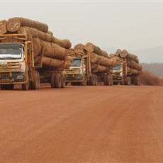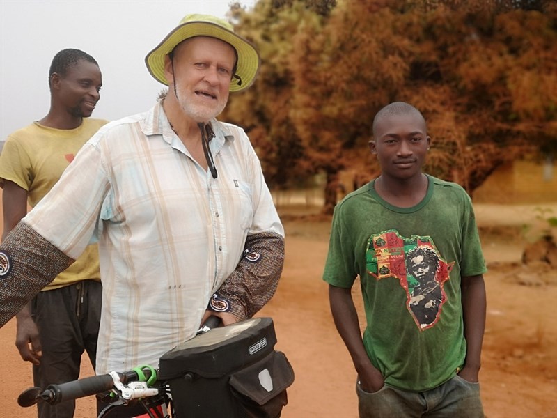 We saw the Chinese road construction engineers busy with measurements, one wearing a traditional straw hat. We saw, tethered to a couple of parked logging trucks, cocks crowing, a fresh meal in the making, no doubt, and saw logs fallen from overloaded vehicles and abandoned on the roadside. We saw small bodies of water the colour of greenstone, sometimes filled with waterlillies. We saw homesteads of tiny huts and swept earth, where, in small numbers, roamed goats, pigs, ducks and chickens. We saw people working hard to scratch a living from a patch of earth. One couple in particular stands clear in my mind’s eye: their hut, maybe eight square metres standing on a small segment of cleared bush, both the man and woman working with hoes between whatever it was they had planted. Some villages boasts a small shop, poorly stocked, some homesteads sell Airtel airtime and loose cigarettes. Daily chores, like fetching water and pounding cassava, take up a lot of time and energy. We saw people lolling at ease under trees and in open lapas providing shade and air. We saw children at play in the dust, coated as we were from top to toe. We saw poverty, and perhaps even hunger, but not, thank goodness, starvation. In one village, a group of young boys chased after me on my bike. This happens fairly often and usually I slow to give them a chance to race my faster steed. Today, one of the boys grabbed at my flag, a no-no in my book. I stopped the bike and turned to look at them, and they took immediate flight.