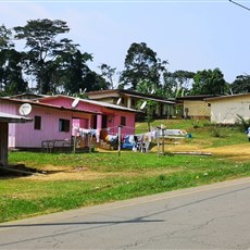 An unremarkable day, with Charl still feeling mildly ill. Our road passed as usual through forest green, with bamboo groves everywhere creating dark caves beneath their bowed stems. Growing tall in the forest and on occasion shading the road, the beautiful cecropia tree with its large circular leaves deeply divided into separate lobes. Along the road, furrows dug for fibre … how welcome that will be once up and running in African towns and villages. At one homestead we saw a broken down truck that had been standing there for so long the entire bed and cab was woven through with spider webs.