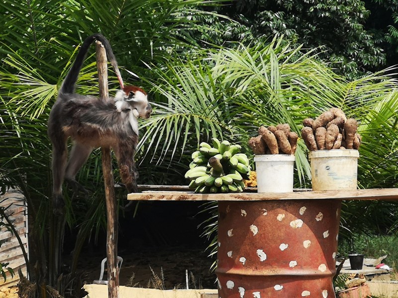 Today particularly, we saw a variety of bush meat displayed for sale outside homes. Many people offer something or other for sale to passing motorists. Usually what is offered is showcased on a wooden shelf lying across a metal drum, or hanging from a sturdy branch secured in a drum or between rocks where it is clearly visible. Cassava, of course, and bananas, and what looks like home-made alcohol. Antelope and gazelle, porcupine and boar, alligator a spotted wild cat, monkeys. What upset us was a small turtle, still alive, tied around its middle and twirling from a branch in the hot sun. I called “monsieur” and a young man came out from the homestead. He spoke some English and said he understood when I said the sun was too hot and pleaded with him to put the turtle in water. Let’s hope he did so.