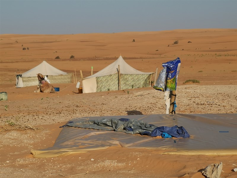 As usual, we cycled past small tented settlements, each with a water bladder, and realised herein lay our salvation. At one “camp” were three or four tents, square with pointed roofs, one with a camel sitting on its haunches outside. A water bladder lay on the verge, but we were reluctant to simply take water without permission, so we hoo-hoo-ed, hoping someone was home.