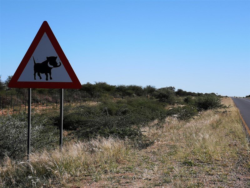 On several occasions we saw a triangular road sign depicting a black-and-white image of a warthog, warning motorists that these wily swine push their way through farm and game fences to feed on the verges and may wander onto the road. We saw several warthog today, on both sides of the fence. Charl managed to spook a male on the verge, impervious to cars and trucks, but made anxious by the bike. The hog turned tail, misjudged the gap in the fence, and ran headlong into it while his family watched on in dismay from the other side of the barrier.